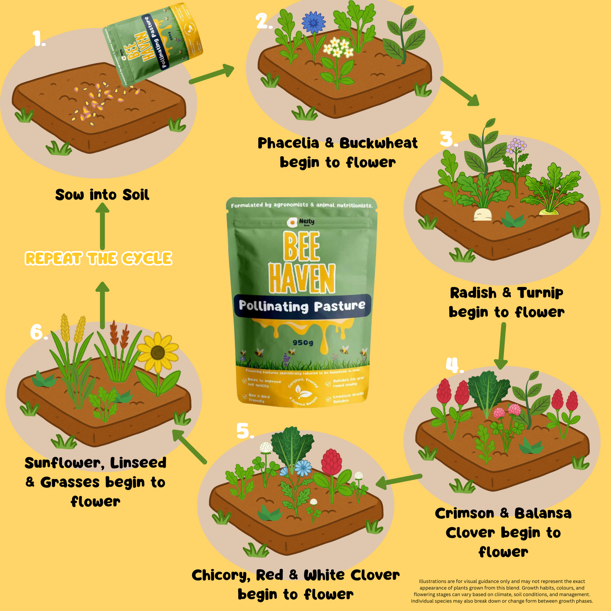 Bee Haven thrives in: Backyard garden beds Orchard floors and understorey areas Pastures and grazing edges Empty or unused soil beds Road verges and nature strips (where permitted) Around veggie gardens to increase pollinator activity