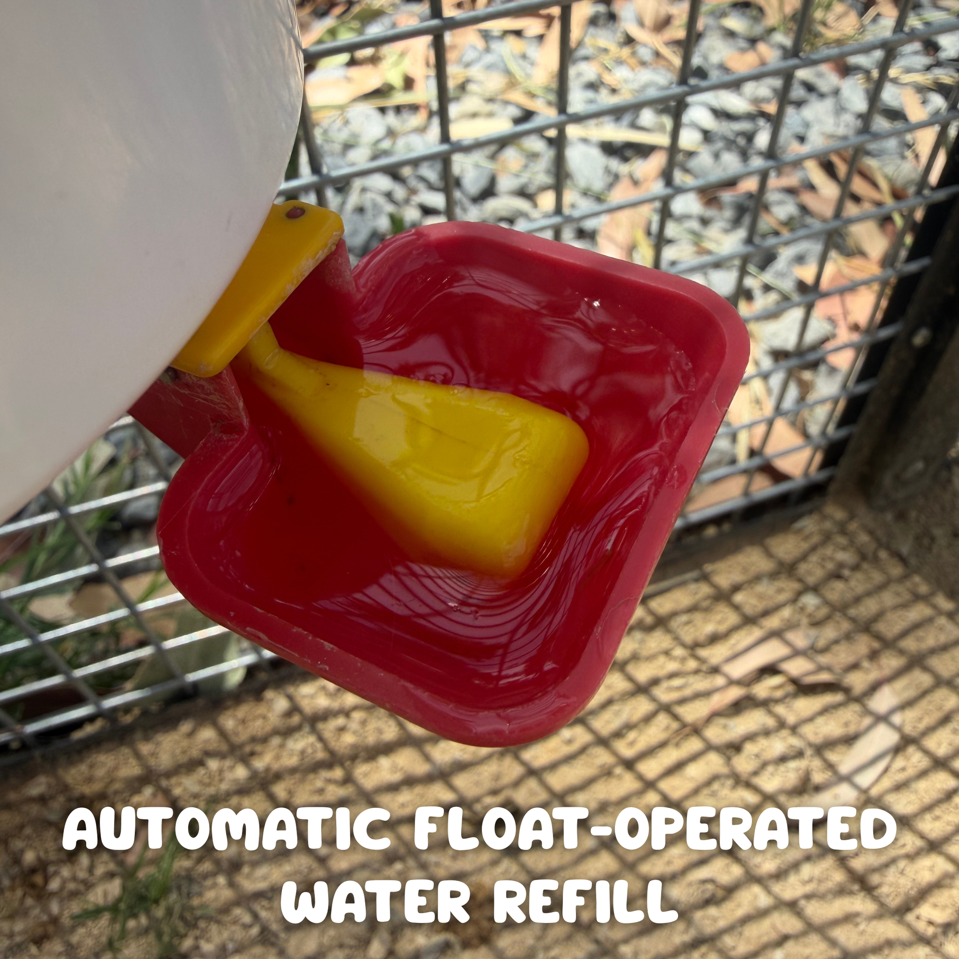 The 4-litre drinker uses two valve-operated cups to minimise spills, evaporation, and dirty water. Only a small amount sits in each cup at once, then refills automatically as birds drink. This reduces the need for constant water changes and supports consistent hydration in the coop.