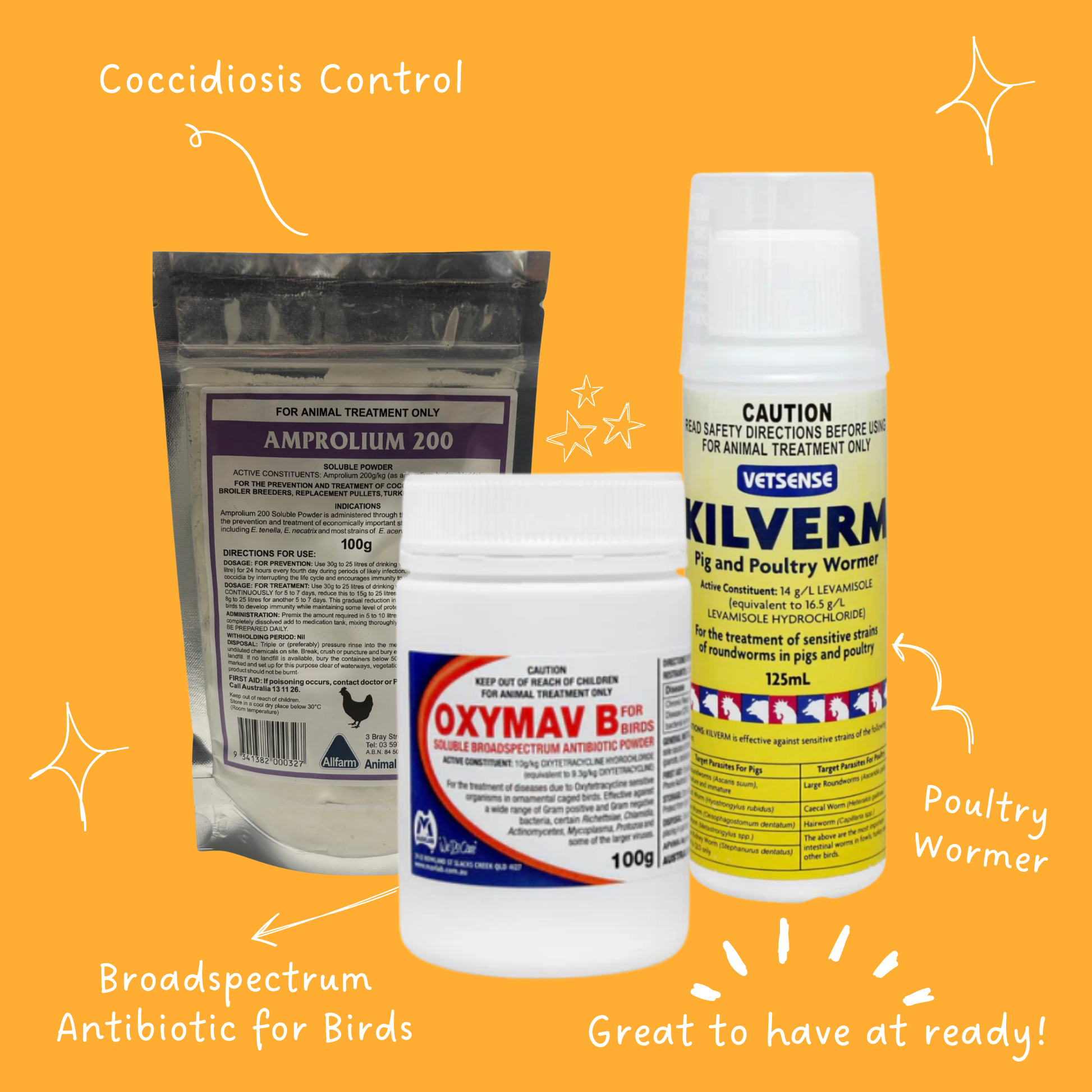 A fantastic kit to keep in the cupboard for when things dont go right! Never will your flock go hungry or have to wait for treatment. This Chicken Starter Kit will bring you peace of mind and hopefully plenty of eggs!