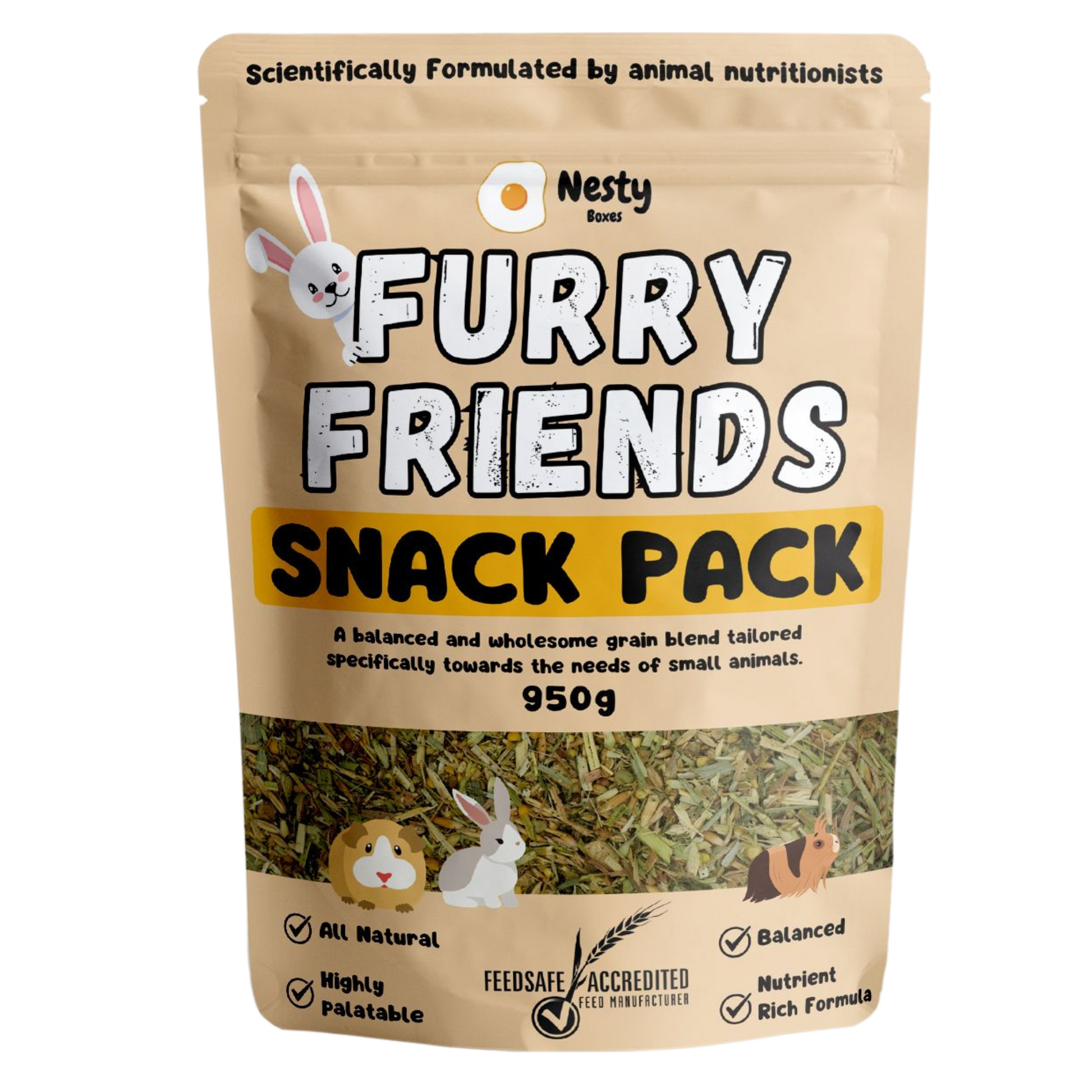 A balanced and nutritious feed tailored to the dietary needs of guinea pigs and rabbits. The Furry Friends Snack Pack is an all-natural formulation incorporating precision disc-milled, Australian-grown grains for improved digestibility, palatability, and feed uniformity.