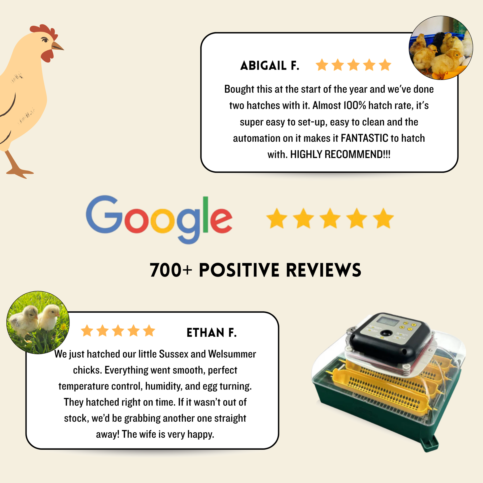 We just hatched our little Sussex and Welsummer chicks. Everything went smooth, perfect temperature control, humidity, and egg turning. They hatched right on time. If it wasn’t out of stock, we’d be grabbing another one straight away! The wife is very happy.