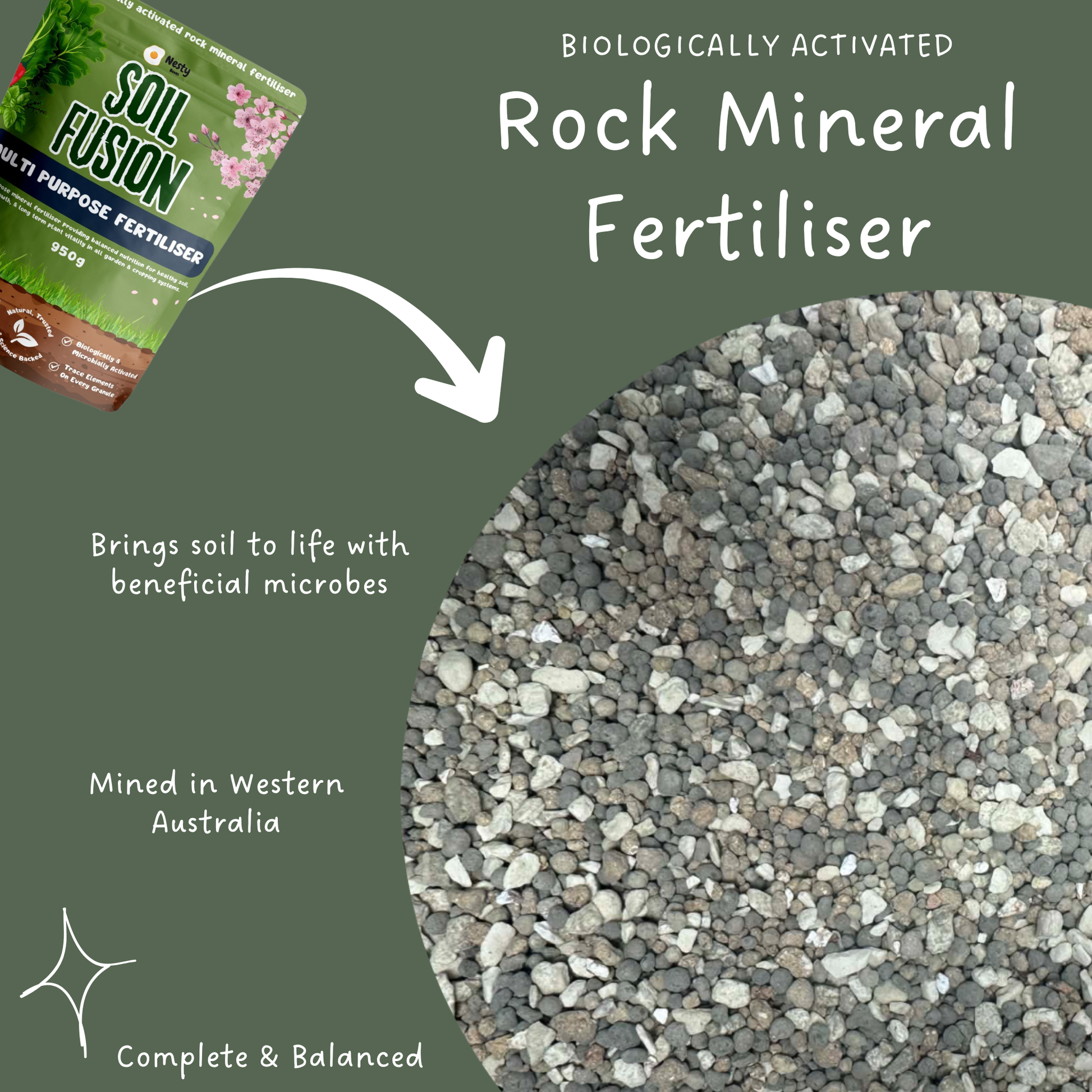 Soil Fusion supplies a full spectrum of essential macro and micronutrients from finely milled Australian rock minerals. It fuels balanced, sustained plant growth without the harshness of synthetic chemicals. Each granule is biologically activated, with beneficial microbes enhancing mineral solubility and nutrient uptake for long term plant availability.