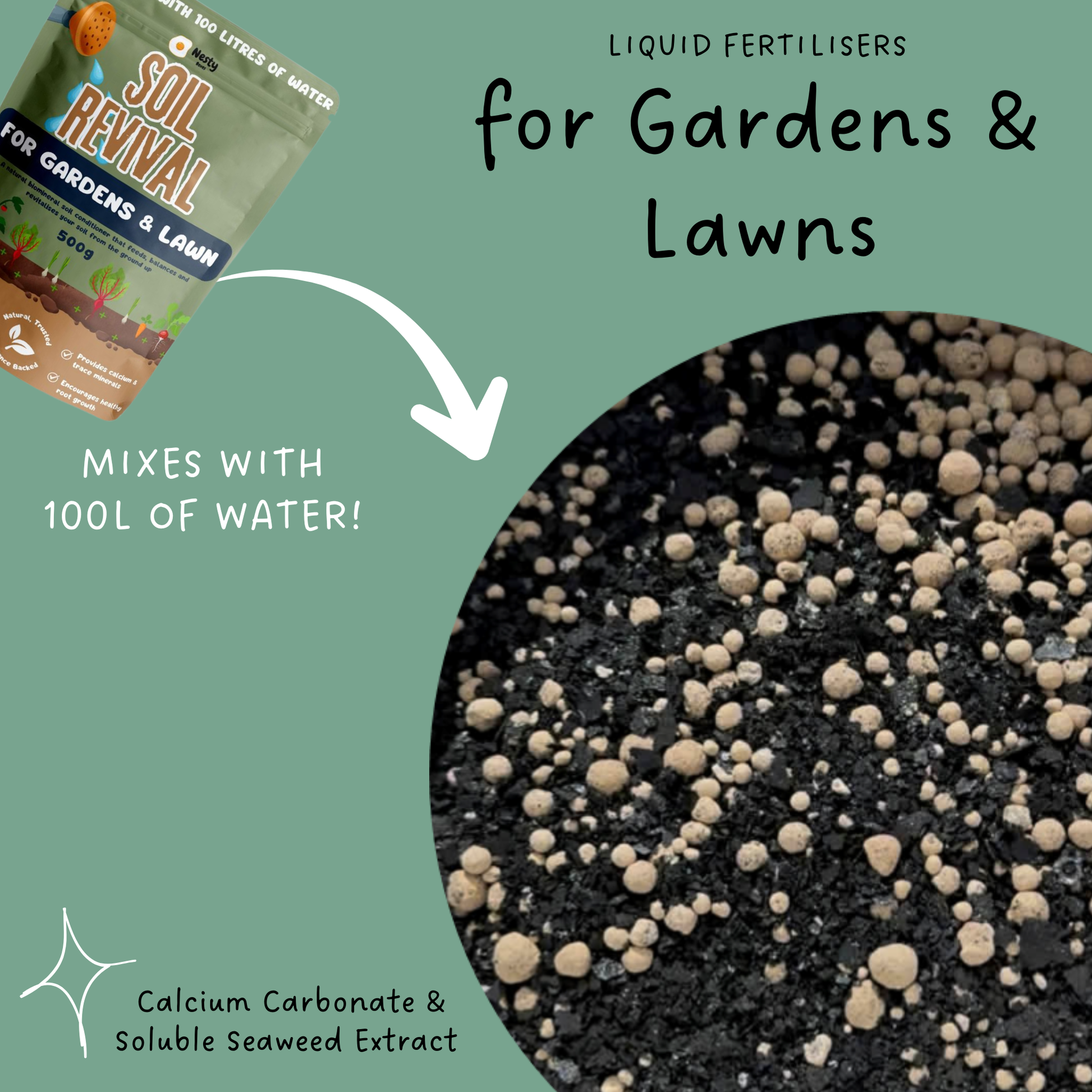Soil Revival is a natural biomineral soil conditioner combining soluble seaweed extract with finely ground limestone. This blend provides calcium and trace minerals in a fine powder that disperses easily when mixed with water. Used as a soil drench or foliar spray, it helps balance soil pH, supports beneficial microbes, and encourages healthy plant growth.